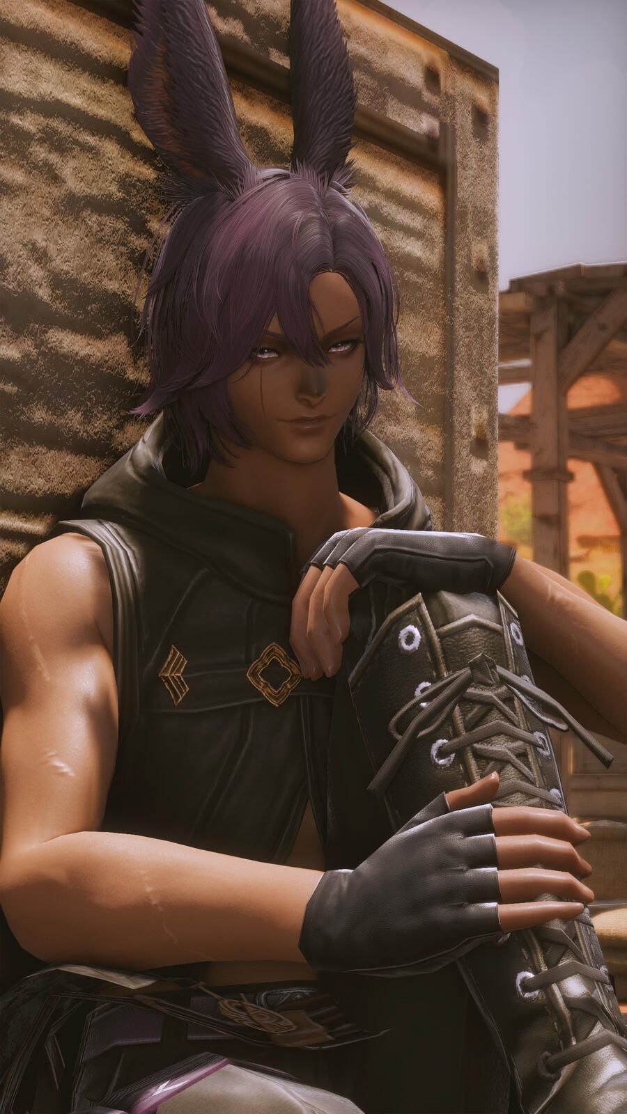 height 187 cm/6'1 hair dark purple with faint highlights. medium length, messy style. skin brown. eyes rose pink. scars one scar covering his right eye, body littered with scars. piercings N/A tattoos N/A other N/A
